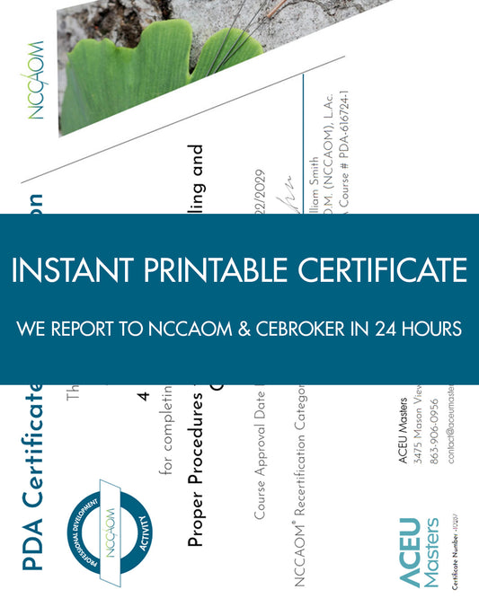 ACEU Masters is an approved provider of acupuncture continuing education by the Florida Board Of Acupuncture, CE Provider #50- 40420. We report your completions directly to CE Broker within 24 hours.